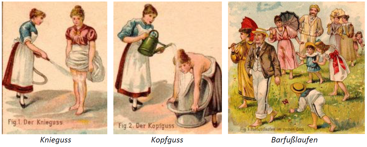 Aber auch das Barfußlaufen, vor allem auch das morgendliche Tautreten auf der Wiese (Barfußgehen auf nassem Gras) oder das Wassertreten dienten für Kneipp der Gesunderhaltung und waren auch Bestandteil seiner Heilmethode. Die nachstehenden Abbildungen einer Kneippkur im 19. Jahrhundert zeigen beispielhaft einen Knieguss, einen Kopfguss und das Barfußlaufen.
